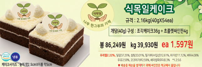 | 제품규격 | 2.15kg (40gX54ea) /조각케이크36g +초콜렛싸인판4g |